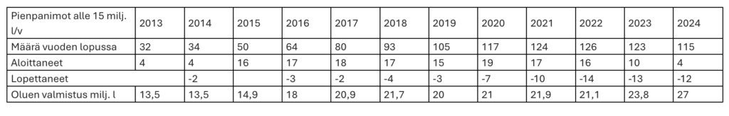 Kun tarkastellaan pienpanimoiden määrää, niin vuonna 2014 pienpanimoita oli vain 34***, jolloin keskimääräinen litramäärä on ollut hieman vajaa 400 000 litraa/pienpanimo, kun taas vuonna 2024 pienpanimoita oli 115 ja litroja per pienpanimo noin 230 000. Selkeä kehitys onkin, että pieniä, alueellisia pienpanimoita on tullut 2010-luvun puolella lisää, jolloin keskimääräinen litramäärä vähenee panimoa kohti.
