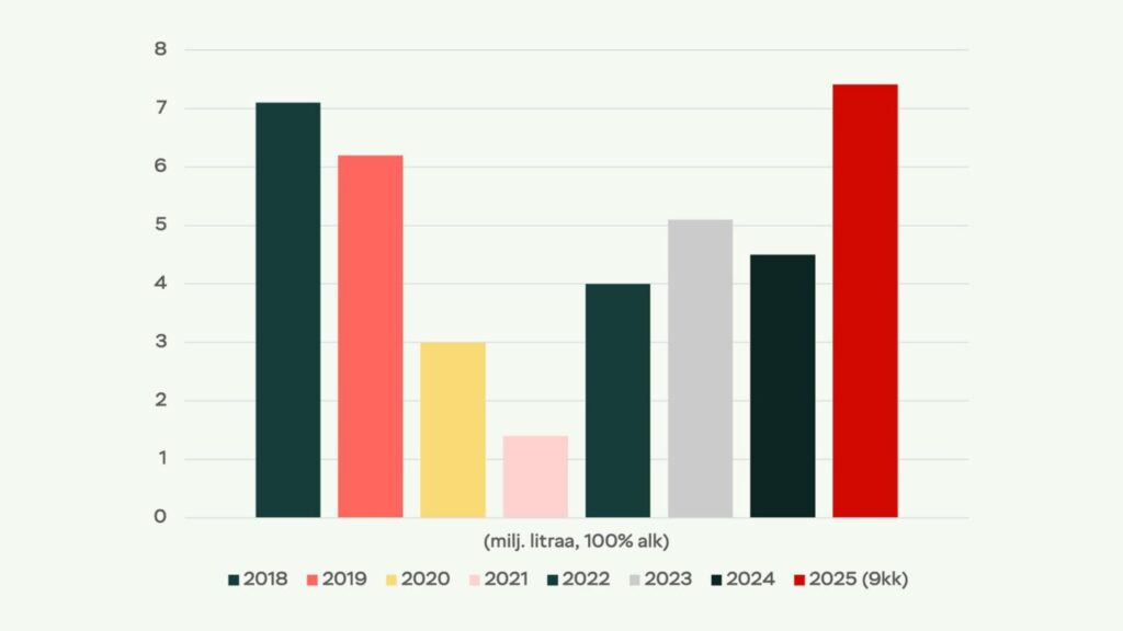 Lupa- ja valvontaviraston (ent. Valvira) mukaan vuonna 2025 alkoholijuomia valmistettiin yhteensä 510 miljoonaa litraa, mikä oli noin neljä prosenttia vähemmän kuin edellisenä vuonna (2024, 513 miljoonaa litraa). Myös alkoholin myynti laski vuonna 2025 verrattuna vuoteen 2024. Tuoteryhmittäin tarkasteltuna myynti laski kaikissa tuoteryhmissä, oluet laskivat 2,0 %, siiderit 5,5 %, juomasekoitukset 1,9 % , miedot viinit 5,0 % ja väkevät juomat 8,9 %.