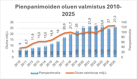 Pienpanimoiden määrä on laskenut huippuvuosista, jolloin Suomessa oli parhaimmillaan vuoden 2022 lopussa 126 pienpanimoa ja/tai pienpanimolupaa***. Lupa-valvontaviraston vuoden 2025 taulukko näyttää hyvin pienpanimoiden määrän ja litrojen kasvun. Viime vuodelta tilastoa ei ole, mutta viranomaisen mukaan sekä pienpanimoiden perustaminen että lopetus on hidastunut, ja tilanne näyttää vakiintuneen noin vähän yli sadan kohdalle.