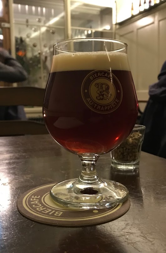 Ensimmäinen kosketus ilmeisen hyvämaineiseen numeropanimoon 523. Oluen nimenäkin pelkkä numero 4, 8,5%. 8,50 CHF. Quadrupel baarimestarittaren mukaan, mutta sellaiseksi aika kevyt, varsin punainen väri. Aika mausteinen tuoksu. Pehmeän karamellinen maku, hyvin makea, hieman mausteisempaa takapotkua havaittavissa. Ihan ok, vaikka peräkärry puuttuu kokonaan. Liian makea tämä on, jotta olisi miellyttävää. Palasin hotelliin, ikkunan alla hillitön meininki joulupuun ympärillä. Bern, Biercafe Au Trappiste, 4.12.2017.