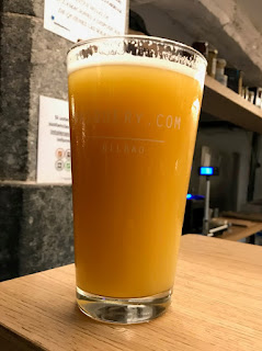 Basquery on panimobaari, monipuolista toimintaa, leipomo samassa yhteydessä. Paljon jengiä, sain vain seisomapaikan leivostiskin ääreltä, ruokapuolelta henkilökunta heitti minut tylysti ulos. Sok omaa tuotanto, mangolla maustettu NEIPA, 6%. Hyvin samea.— Hedelmää on nyt oluessa, mangoakin reilusti. Aamiaismehuosastolle mennään, mutta yllättäen jälkipoltteessa on potkua, yllättävän kova katkeruus, lähes Sonnisaari-tasoa. Liikaa hiilihappoa, mutta reissun paras tuote tähän mennessä. Bilbao, Basquery, 9.3.2019.