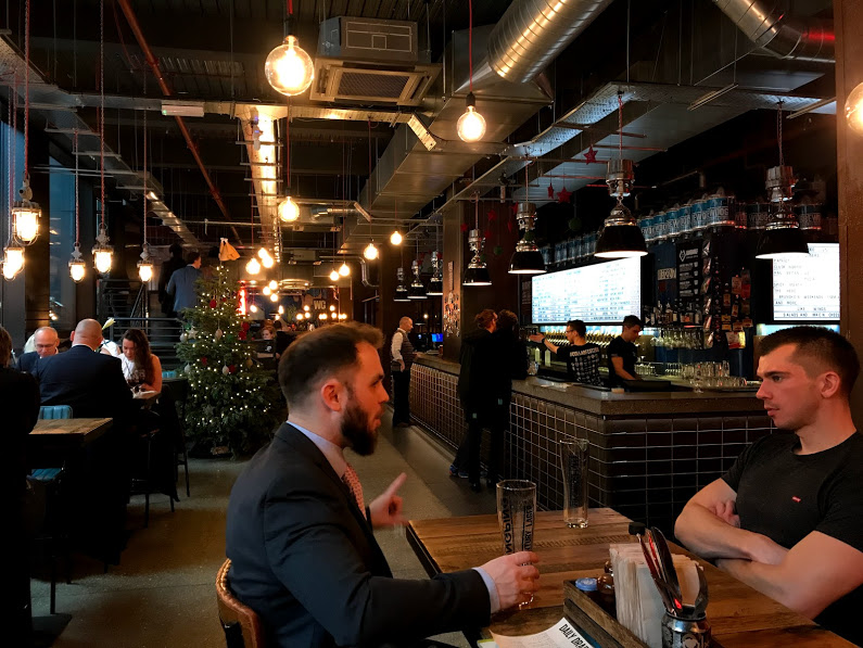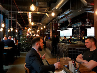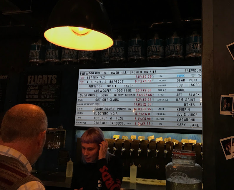 Valtava BrewDog-baari Tower Bridgen pohjoispuolella, näköjään ns. outpost, eli oma koepanimo paikalla, intensiivistä maltaan tuoksua baarissa. Kokeilin omatuotantoa, 7,5%, ehkä jonkinlainen black IPA. Täälläkin on paljon myöhäisen lounaan syöjiä. Musta olut, hedelmää on, hieman paahdetta, kuivaa, mutta ei kunnolla katkeruutta. Kohtuullinen olut, mutta ei erinomainen. Lontoo, BrewDog Tower Hill, 6.12.2018.