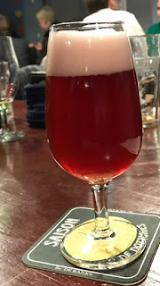 Iris ja vadelmavariaatio Rosé de Gambrinus olivatkin sitten jo aiemmin tsekattuja kegeistä, mutta otin tyyppaukset niistäkin. Ei mitään halpaa, mutta ei kiskomistakaan näin harvinaisella kamalla, 7€/20 cl. Iris on mausteisempi ja Gambrinus varsin hennosti vadelmainen, molemmissa intensiivisempi happamuus kuin aprikoositavarassa. Stadin Panimobaari, 4.10.2017.