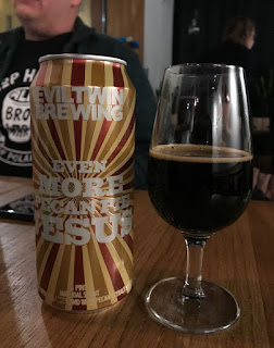 Tanskalais-amerikkalaisella Evil Twinilla on Even More Jesus -niminen imperial stout, jota en ole koskaan maistanut. Nyt Antti J. Jokinen (ei siis Krista Kososeen liitetty Antti) tarjosi ex-pomolleni Antti Hämäläiselle, seuraan liittyneelle Ari Nyforsille ja itselleni pekaanipähkinäpiiras-versiota oluesta. 12%, yllättävän kuivaa, paahteista, lakritsaa, miksei pähkinääkin. Ari N totesi oluen maistuvan hieman kallioimarteen juurelle. Sellaisesta en ole kuullut, mutta varmaankin näin. Sosiaalinen vuorovaikutus edelleen hallitsevaa arviointitilanteessa, mutta yllättävän hyvältä Jeesus-olut vaikutti. Panema, 17.12.2018.