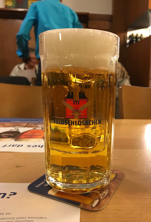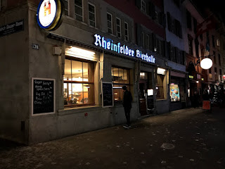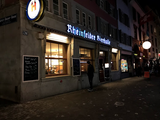 Zürich näyttää siis tällä kokemuksella suhteellisen heikolta olutkaupungilta. Kyllästyin craft-meininkiin ja menin syömään Rheinfelder Bierhalleen. Modernimpi meininki kuin Zeughausenissa, vähemmän turisteja. Teollisuusolutta, Feldschlösschenin humalahelmi 5,2%. Hyvin kirkas, maltainen, täyteläinen, kevyesti katkera. Erittäin puhdas helles, tykkäsin kovasti. Schnitzeleissäkään ei valittamista. Zürich, Rheinfelder Bierhalle, 3.12.2017.