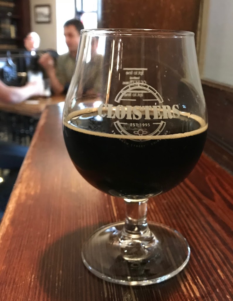 Cloisters-baari miellyttävä koruton juottola jossain vanhassa hengellisessä rakennuksessa, sisällä sitä ei huomaa. Kävin täällä jo 1999, mutta muistikuvat hämäriä. Tämänkään baarin tarjonta ei nyt oikein vakuuttanut. 9 caskia, 5 kegiä, epämääräisiä tyylejä. Päädyin vahvaan suklaastoutiin, 12,5%. Todella makea on, lähes mansikkamarmeladia, alkoholin poltetta, makeutta vaan, ei tästä oikein mitään järkevää otetta saa. Baarissa vain seisomatilaa, se oli 1999 Edinburghissa yleistä, istumaan ei pubeissa mahdu. Epämiellyttävä tuoksu leijailee paikassa, vuorokausi sitten lattialle kaatuneen oluen löyhkä. VBM tarkoittaa isoa hirveä, very big moose, niitä ei taida Skotlannissa olla. Edinburgh, Cloisters, 26.10.2018.