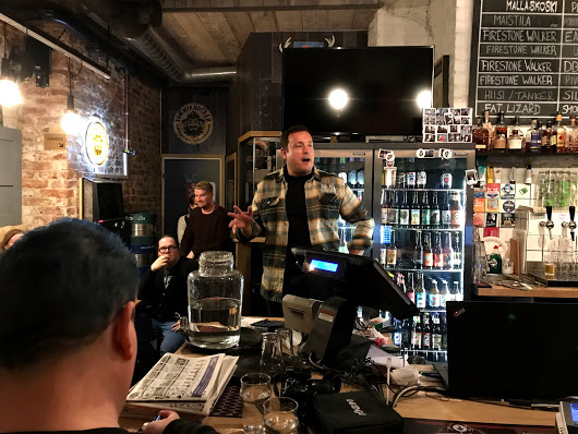 Tommyknockerissa oli jo huone täynnä ja panimon perustajan David Walkerin pikkuveli Adrian aloitti show’n samantien. Lähes karikatyyristä jenkkiuhoamista käytännössä huutamalla koko ajan. Periaatteessa hilpeä meininki, mutta ehkä olisi kannattanut vielä harkita lähestymiskulmaa uudelleen, kun nyt kuitenkin Euroopassa ollaan. Pidin Firestone Walkerista selvästi enemmän ennen tätä esittelyä kuin sen jälkeen.—