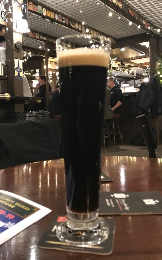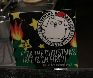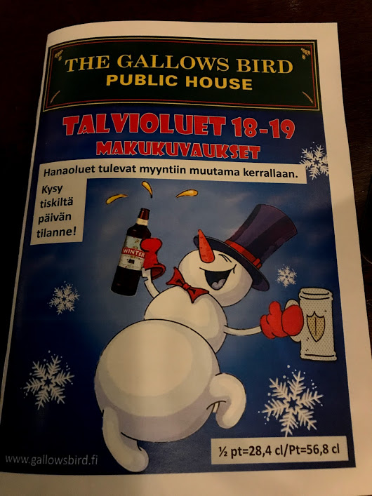 Seuraavaksi BrewDogin Mistletoe Mafia Toasty Amber Lager, edelleen 4,5%. Maltainen olut, paahtoleipäistä fiilistä kuivasti, mutta liikaa hiilihappoa. Lievästi hedelmää ja paahteisuutta hyvin kevyesti. Ruotsalaisen Poppelsin Vintervärmaren kohdalla sosiaalinen tilanne pääsi enemmän pinnalle. 7,8%, makeaa mausteista paahteisuutta, enempää en huomannut.— Hollantilaisen Uiltjen F*ck The Christmas Tree Is on Fire session lopuksi, 10%. Lakritsaa,— muitakin mausteita, aika pehmeää, jopa raikasta, alkoholi ei tunnu. Tosin arvostelukyky saattoi heikentyneen tässä vaiheessa varsin ripeästi toteutetussa sessiossa. Haluttaisi käydä listalta myöhemmin tulevia oluita maistelemassa, mutta joulu-tammikuun kalenteri vaikuttaa kovin täydeltä. Espoo on niin kaukana. Espoo, Gallows Bird, 30.11.2018.