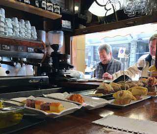 Desyssä siis olikin kaksi hanaa tarkemmin tutustuttua, toisessa Sirenin tuttua Soundwavea ja toisessa paikallisen Grossin lageria. Caña 5€, pinta 6€. Päädyin pintaan. 6,0%, sameaa. hedelmäistä, varmaan jenkkihumalia, ei katkeroa, mutta puhdasta. Englannin taito kyllä seudulla heikkoa, ei edes nuori baarityttö osannut sanaakaan. Tomaatteja ja jotain kalalohkoja tuli kaupan päälle olutsedälle. Tai niin luulin, kyllä isoisä tms rokotti niistäkin poislähtiessä kolme euroa. Tästä huolimatta hyvä fiilis, luultavasti palaan paikalle, koska koko päivän auki. Donostia, Desy, 12.3.2019.