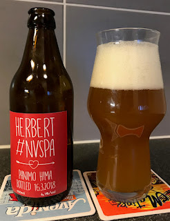 Kotioluen hovihankkijani HIMAn asiamies välitti taas lisää tuotteita, joista tuoreeltaan maistoon 16.3.2018 pullotettu NEIPA. NEIPA tämän piti olla, vaikka etiketissä lukeekin NVSPA. HIMAlla siis tosiaan nyt etikettikin pullossa. 6,7%, tällä kertaa ei tarkempaa reseptiä tiedossa. Varsin sameaa on, tuttuja trooppisten hedelmien aromeja. Maussa melko runsaasti hiilihappoa, pehmeitä hedelmiä, lievästi makeutta, kirpeyttä, pihkaa, hieman tuhkaisuuttakin. Katkeruus on pienimuotoista, mutta kitalaen takaosaan takertuvaa. Hartsiakin löytyy. Intensiivisempää hedelmäisyyttä ja enemmän raikkautta voisi olla, mutta mitään virheitähän tässä ei ole. Tuntuu jopa jonkin suuremman kaupallisen panimon liian varovaiselta tuotteelta.