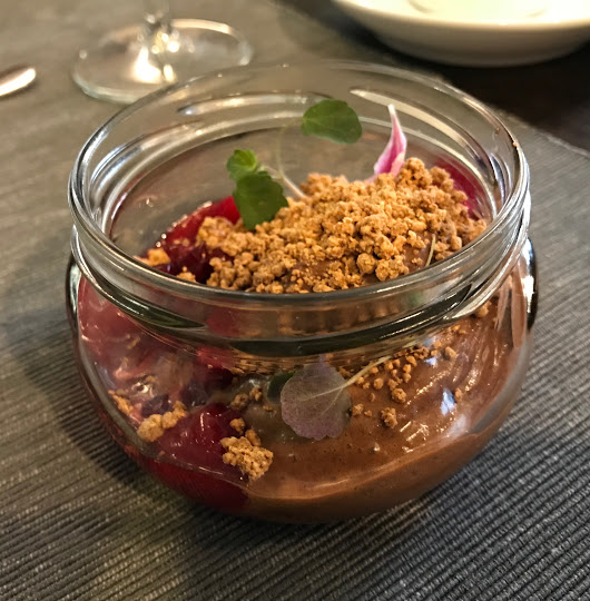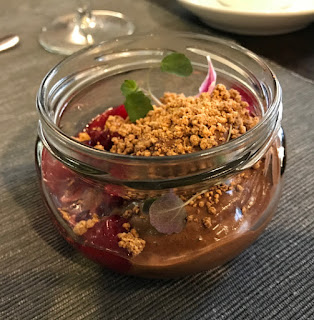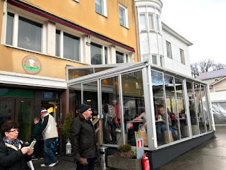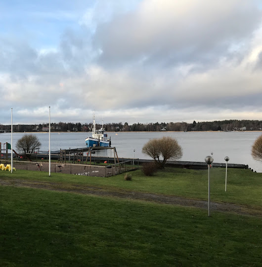 Parin tunnin itseohjautuva osuus päättyi tähän ja siirryimme pienoisbussilla läheisen Sea Front -hotellin Strandis-ravintolaan, jossa palkitun keittiömestarin Samuel Mikanderin suunnittelema lounas. Hän oli valinnut kasvistarjonnan, koska vierasjoukko niin naisvoittoinen. Sehän sopi minullekin ja mutustelin tyytyväisenä halloumijuusto-pohjaisen annokseni itävaltalaisen valkoviinin säestyksellä. Yksi leideistä halusi lihaa ja hänelle tuli pyöreähkö iso jauhelihapihviannos, jota vilkaisin kieltämättä hieman leuka alaspäin loksahtaen. Jälkiruokana cappuccinomoussea fudgen ja puolukoiden kanssa, sekin erinomaista.—