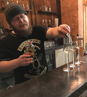 Sitten esittelyvuorossa tislaamo, jossa ei nyt tietenkään ihmeempää nähtävää näyttävän tislauslaitteiston ja tynnyrien lisäksi. Giniä ja akvaviittia syntyy, viskiä tulee parin vuoden päästä PX-sherrytynnyreitä näytti olevan kypsytyskäytössä. Maistiaisilta ei vältytty täälläkään, ensin Ägräksen maltillisesti kuminoitua akvaviittia ja sitten Paavin polku -oluesta tislattua Bierbrand-pontikkaa, joka 52%. Yllättävän pehmeää tämäkin, ei kovin monimuotoinen, mutta alkoholi ei hallitse liikaa kokonaisuutta.—