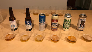 Itselläni oli aikaa noin tunti ennen sopimaani Sonnisaari-teistingiä Sori Taproomissa, joten homma hoidettiin ripeästi. Tietenkään juttua ei jätetty näin yksinkertaiseksi, vaan Timo hommasi maisteluun kolme muutakin olutta, joita en nähnyt ennen sokkoteistingiä. Oletettavasti tietenkin Stadin kamaa. Kuusi olutta siis rivissä, oma settini oikealta vasemmalle. Aikaa oli todellakin vähän, joten huomiot ja varsinkin muistiinpanot lakonisia.—