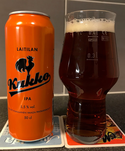 Kukko IPAn vahvuus on siis noussut 5,5-prosenttiin maitokauppatilanteen muuttuessa. Tölkki muuten ennallaan ja Kukko-brändikin jatkaa tässä. Meripihkainen kirkas olut, kevyttä vaahtoa. Tuoksu on aika neutraali, suoraan sanoen en oikein saanut mitään irti, jotain kevyttä hedelmäpastillirasian avaamisen jälkeistä vienoa leijuntaa. Maku on yleishedelmäinen, brittityylinen, kalkkia, kovuutta, aika brutaalia, varsin mitäänsanomatonta. Katkeruutta on vain nokare, erittäin matalaprofiilinen tuote. Aiemman kevyemmän version arvion perusteella suhteellinen katkeruus tuntuu vähentyneen rutkasti. Tämä oli selvä pettymys, paljon parempaan pitäisi IPA-otsikon alla yltää. EBU-lukema on hämmästyttävän korkea 65, humalina Columbus, Centennial ja Amarillo, joita ei mausta löydä oikein ollenkaan. Ilmeisesti niitä on todella vähän.