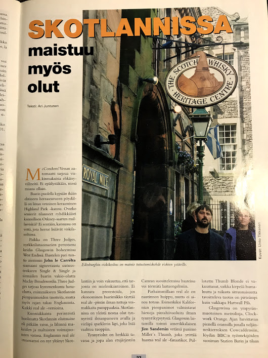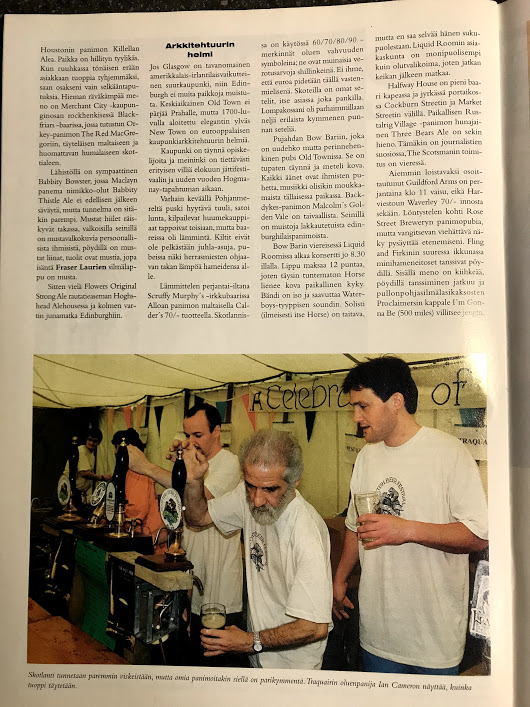 Olutharrastukseni oli edennyt vaiheeseen, jossa päätin tehdä Skotlannin reissulla tarkempia muistiinpanoja kuin aiemmin. Ajattelin kirjoittaa matkakertomuksen ja tarjota sitä Unto Tikkasen uuteen Juomanlaskija-lehteen. Olin lukenut Tikkasen aiemmasta Olut-lehdestä matkatarinoita ja arvelin pystyväni vähintään samaan tasoon. Näin kävikin, sain jutun läpi, tosin Unto pisti pari omaa kuvaansa jutun oheen, omat kuvani olivat niin surkeita. Juttua on nyt aika vaivaannuttava lukea. Välillä tuntuu, että henkisesti ei ole juuri teinivuosista kehittynyt, mutta ehkä jotain muutosta silti tapahtuu jopa keski-iässä. Nykyään kirjoittaisin hieman eri tyylillä.