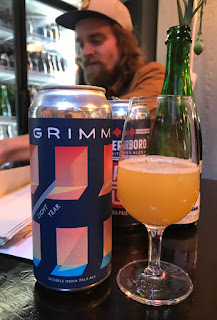 Odotetuimpina maistoon kolme Grimmin tölkkiolutta. Parin vuoden takaisella New Yorkin keikalla tuli muutama Grimm-olut tsekattua, mutta silloin kyseessä oli sopimusvalmistaja. Viimeisimmät käänteet panimon kohdalla jäivät itselleni hieman epäselviksi, mutta nämä tölkkioluet tehty Virginian Sterlingissä, ilmeisesti omassa panimossa. Ensimmäisenä Light Year, DIPA, 8%, Mosaic, Wai-iti, Galaxy. Samea ja mehuinen taas. Ei erityisen superraikas, mutta mehua on maussa taas hyvin, hieman katkerampi kuin Interboron olut. Grimmin Signal to Noise (josta unohdin ottaa kuvan) myös DIPA, 8,5%. Taas heikko tuoksu, samea. Appelsiinia, maku on kunnossa, hyvää mehuisuutta, joskaan ei katkeroa. Grimm Tom Tom samanvahvuinen DIPA, 8,5%. Nyt raikkaampi tuoksu, kirkkaampi ulkonäkökin. Pehmeä, tölkitetty huhtikuun 16. päivä. Maku ehkä ei edellisen tasoa, mutta katkeruutta nyt kohtuullisesti. Erittäin hyvää taas.