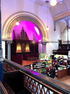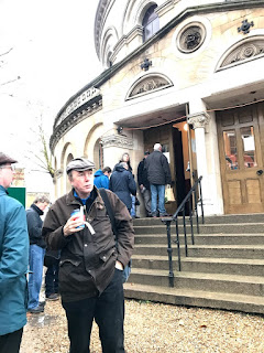Näillä kulmilla Hackneyssa en ole ennen liikkunutkaan, mutta näppärästi paikalle Overgroundilla Liverpool Streetiltä. Kappelia vastapäätä Clapton Craft -niminen olutkauppa, josta yritin tilata neljästä hanasta odotteluolutta, mutta hanat varattu pelkästään growlereiden täyttämistä varten. Huono homma, britit eivät ole vieläkään oikein kartalla missä mennään. Totta kai kaupoissakin pitää saada dokata paikan päällä.