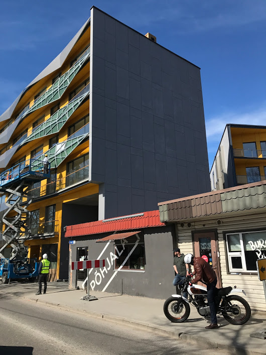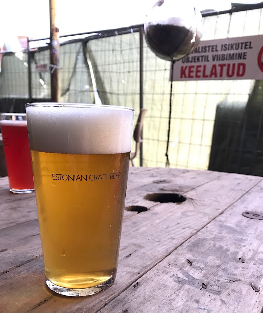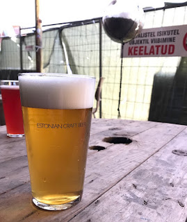 Tallinnassa kirkas auringonpaiste, mutta kohtuullisen viileä tuuli. Jatkoin laivaseurueen mukana Põhjalan salakapakkaan, joka käsittääkseni oli välillä kiinni, mutta nyt auki ainakin olutfestivaalin aikana. Täällä oli tavallaan festivaalin check-in, ennakkoliput voi vaihtaa rannekkeeseen. Oululaisia tuttuja paikalla samalla asialla. Muutama Põhjalan olut hanassa, uusi kuivahumaloitu saison, kuiva,— hapan,— tiukasti limakalvoja supistaen jopa. 5,5%, hieman katkeruuttakin. Raikkaampi hedelmäisyys stemmaisi paremmin belgihiivan kanssa. Kävin ensi kertaa Speakeasyn perätilassa, jonkinlainen rähjäinen lautaterassi, joka oli jäämäisillään viereisen rakennustyömaan jalkoihin. Varmaan koko baarirakennus puretaan piakkoin. Tallinna, Speakeasy, 5.5.2017.