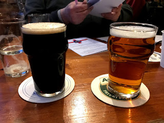 Miltonin Justinian hyvin vaalea golden ale, vain 3,9%. Humalaa ja hedelmää, ohut, yllättävän voimakas peräkärry, pitkään kestävä, ihan näppärä. Banks & Taylorin SOD (Shefford Old Dark) tumma, aika vaisu, pehmeä, ei katkeroa, mutta puhdas. Saman panimon Dragon’s Gold ESB varsin vaalea, pehmeän pihkainen, hedelmää, karamellia, ei katkeroa. Session päätteeksi Wibblerin Stoaty McStoatface, joka on stout, 5,3%, pehmeää hedelmää, hieman paahdetta,— kevyesti katkeroa, hyvin puhdasta.