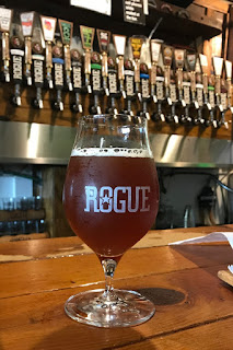 Karamellinen strong ale, 7,8%, mutta tässä oluessa kiinnosti IBU-lukema, tasan 100. Hyvin maltainen, lähes leipää, aika kuohkea, tuorekin. Hedelmäisyyttä ei todellakaan ole. Katkeruutta lähdin siis etsimään, kyllä sitä on, mutta makeismainen makeus saattaa niin pitkälle sitä kohti, että ei nautinto kaksinen ole. Puhdasta vahvaa hopperoitua amber alea käytännössä. Aika heikko olutvaikutelma siis lahden takana Roguen päämajassa, mutta aina ei voi voittaa. Rogue on ehkä nykyään tippunut alan kehityksen kyydistä. Avainhenkilöitäkin taitaa olla tiukasti Trump-leirissä poliittisesti. Rogue on kuitenkin merkittävä toimija länsirannikon oluiden menestyksessä. Baarissa huomasin poislähtiessä Don Youngerin muistolaatan, niitä on varmaan useassa paikassa, edelliseen törmäsin Denverin Falling Rockissa. Hyvä tunnelma baarissa kuitenkin ja lähdin toiveikkaasti paluumatkalle saman hulppean sillan yli. Newport (Oregon), Rogue Headquarters, 18.9.2018.—