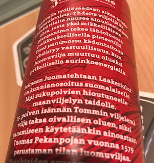 En muista ennen Saimaan jouluolutta juoneeni. Nyt sellaista tarjolla vanhahtavan etiketin kera, nimikin retrotyyliin partitiivissa. 4,5%, Koffin tyyliin korostetaan mallasohran viljelijää. Luomukamaa Mattisen tilalta, aurinkoenergialla, kauraakin mukana. Etiketin tekstissä puhutaan hämmentävästi Saimaan Juomatehtaan Laakerioluesta, joka on käsittääkseni eri tuote kuin tämä Jouluolutta. Varsin tumma väri, enemmän mahonkinen kuin meripihkainen. Kohtuullisesti vaahtoa, joka hiipuu nopeasti. Tuoksu karkean karamellinen. Maku on hyvin makean pastillimainen, esanssimaista karamellisuutta. Mitään oluen luonnollista maltaisuutta ei karamellin takaa löydy. Muuten maku on hyvin lyhyt, tämä on varsin epämiellyttävä kokemus. Ostopaikka Helsinki, Vallilan S-Market.