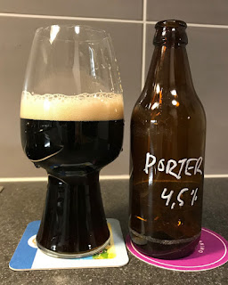 Kun törmäsin yllättäen Pikkulinnussa lauantaina olutkouluttaja ja kotiolutlegenda Sampo Järveen, sain häneltä mukaani pari näytepulloa. Ensimmäisessä porterissa vahvuutta 4,5%. Maltaista Sampo jotain kertoi, mutta ei jäänyt mieleen. Keskitasoinen vaaleahko vaahto lähes mustassa oluessa, hyvin intensiivinen paahteinen maltainen kahvinen talkkunainen tuoksu. Maku on odotetusti laimeampi, jopa vetisen maltainen. Hieman hedelmäinen, luumua, mutta mallas silti hallitsee. Odottamaani kahvia ei oikein tunnu. Hiilihappoisuus hieman keskitasoa matalammalla. Hyvin kuiva, ehkä vähän Guinnessinkin tyylistä kuivuutta. Katkeruutta ei paljoa, mutta tuntuu silti. Erittäin puhtaan makuinen, lähes kliinisen tuntuinen. Ehkä vähän tylsä, liian siisti, matalaprofiilinen, mutta varmaan juuri sellainen kuin suunniteltu.