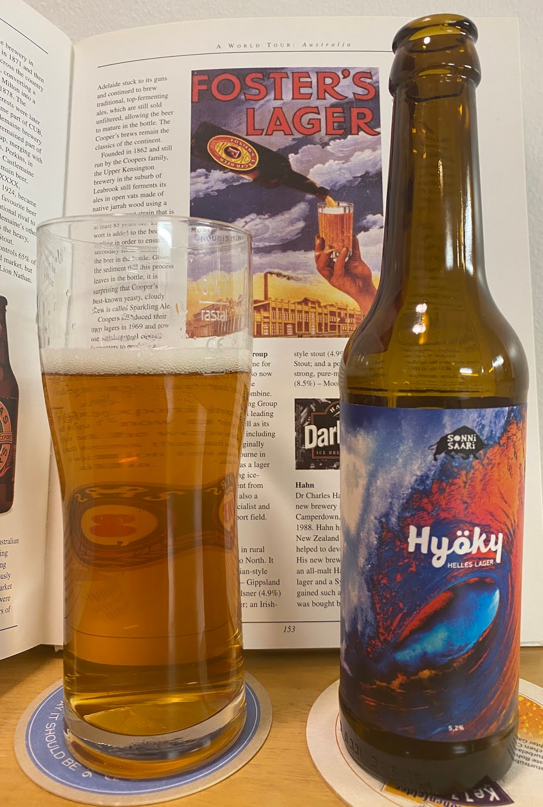 Join tammikuussa Seinäjoen festareilla Sonnisaaren uutta hellesiä ja tykkäsin kovasti. Sittemmin sain palautetta, että Helsingin mehukaljakuplassa kroolaava bloggaaja löysi tuosta oluesta enemmän katkeruutta kuin siinä oikeasti on. Ehkäpä niin. Nyt tilaisuus uudelleenarviointiin, kun Sonnisaaren koronapaketissa oli uuden keittoerän Hyökyä. ”Pieniä muutoksia” luki Timo Kanniaisen saatekirjeessä, ei sen tarkempaa. Tummankeltainen tai vaaleanruskea kirkas olut, ohut vaahto. 5,2 %. Tuoksussa makeaa maltaisuutta. Varsin täyteläinen maku, lievää hedelmäisyyttä maltaan ohessa. Seinäjoella löytämäni ”karheus” ei nyt erotu, ehkä hiilihappotaso on nyt alhaisempi. Pohjanmaalla löytämäni ”huikea” katkeruus kieltämättä tuntuu hämmentävältä, siellä varmaan jokin ympäristötekijä aiheutti efektin. Onhan tässä katkeruutta, mutta melkeinpä tyylinmukaisesti eli varsin maltillisesti. Olisi varmaan pitänyt nyt juoda ennen hazy-kamaa, tämä tuntuu sen jälkeen liian konservatiiviselta. Hyvää täyteläistä puhdasta lageria kuitenkin, hedelmäisyydestäkin huolimatta.