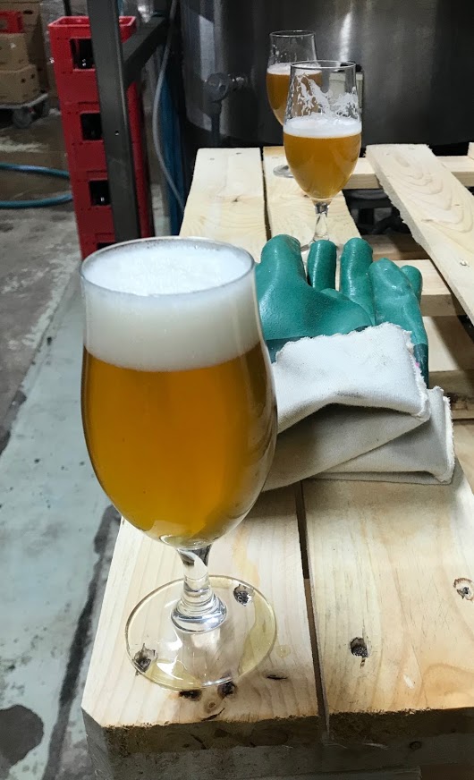 Aki ja Juhani olivat aluksi kiinni pullotushommissa, mutta muuten päästiin käynnistämään istunto (tosin panimossa ei tuoleja, joten seisaaltaan vedettiin) ns. extra pale alella, 4,5%. Tämä osoittautui tutuksi Mosaicaliksi, ehkä reseptiä nyt hieman rukattu. Muutenkaan ei erityisempiä sensaatiomaisempia uutuuksia tarjolla eri syistä, mutta nythän päästiin kurkistamaan panimon arkisempaan toimintaan. Pale Ale erittäin vaaleaa, sameaa, huikea sitruksinen aromihyökkäys. Stadilla tämä ei ole ennenkokematonta, mutta aivan tällaista intensiivisyyttä ei heti muistu mieleen. Hedelmää hyvin maussakin, kuva ei tee oikeutta oluelle, en saanut kunnolla tankista vaahtoa rakennettua lasiin. Kevyt katkeruus, mutta sitäkin on.