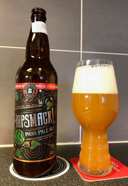 En ole muuallakaan Toppling Goliathiin törmännyt, mutta nyt yllättäen Alkon listoille kaksi olutta ilmaantui. Maahantuojana Craft & Cask, pullokokona ns. bomber, 65 cl. Hopsmack on IPA, 7,1%. Erinomaisen informatiivisesti suomenkielisessä lisätarrassa kerrottu pullotuspäiväksi 27.9.2017. Se on IPAlle korkea ikä, valitettavasti.— Alkuperäisessä etiketissä ei ole alkoholivahvuutta, mutta tekstissä puhutaan Double IPAsta. Ratebeerissä vahvuudeksi on mainittu 8% ja IBU-lukemaksi hillitön 175. Panimon omilla sivuilla 7,7% ja 100 IBU.—