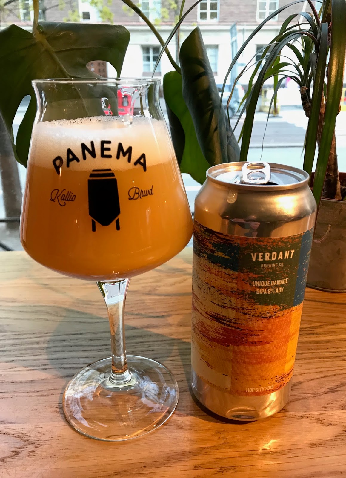 Jotenkin luulin juoneeni jo aiemmin Verdantin oluita, mutta blogin mukaan sellaista ei ole tapahtunut. Panimo sijaitsee Cornwallin Falmouthissa. Tuli saman tien lähes pakottava tarve vierailla paikassa, Exeteriä lähempänä tätä Englannin lounaiskolkkaa en ole tähän mennessä päässyt käymään. Unique Damage on DIPA, 8%, kauraa, vehnää, humalina Idaho 7, Galaxy, Cascade, Columbus. Jos oikein tölkin pohjan merkintöjä tulkitsen, tölkityspäivä on 15.4.2019, 22 päivää sitten. Hintaa 44 senttilitran oluttölkillä oli Alppiharjuun roudattuna 14,50€. Tölkissä myös arvoituksellinen teksti Hop City 2019. Se ehkä viittaa Leedsissä 18.4.2019 alkaneeseen olutfestivaaliin. Ehkä olut lanseerattiin siellä.—