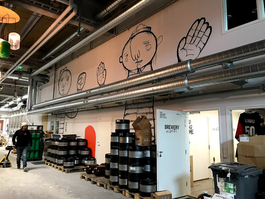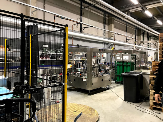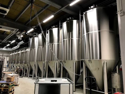 Tyypillinen pienteollisuusympäristö, mutta muuten RPS ei kovin tyypillinen ole suomalaisessa craft-skenessä. Investoinnit ovat olleet melkoisia kuten näkyy mittavasta kartiokäymistankkien rivistöstä. Viisi suurinta ovat aivan tuoreita hankintoja, pullotuslinjakaan ei ole pienintä mallia. Itse asiassa paikalla oli italialaisia akäymistankkiasentajia, joihin törmäsin jo aiemmin Kuopion yössä. Keittokoko on 2000 litraa ja kuivahumalointiinkin löytyy laitteistoa. Erikoisinta kompleksissa on takaosan laajennuksesssa toimiva kahvipaahtimo. RPS paahtaa siis omaa kahviakin, raakakahvia näkyy saapuneen perinteissä juuttisäkeissä. Panimokierrosta en päässyt näkemään täydessä komeudessaan, mutta jonkinlaista valoshowta asiaan näyttää liittyvän. Yläkerrassa oli vielä täysimittainen edustuskabinetti, jossa persoonallinen pölkkyistuiminen sauna. Etuosan hanahuone oli sekin tavallista mietitymmällä otteella suunniteltu. Panimomyymäläkin on samassa tilassa, mutta toistaiseksi vielä vain korkeintaan 5,5-prosenttisille tuotteille. Toisaalta RPS ei vielä vahvempia oluita teekään. Varsin vaikuttavaa kaikin puolin. Laajennusvaraa on tässäkin tilassa ja lisää neliöitä voidaan naapurien suunnasta liittää.