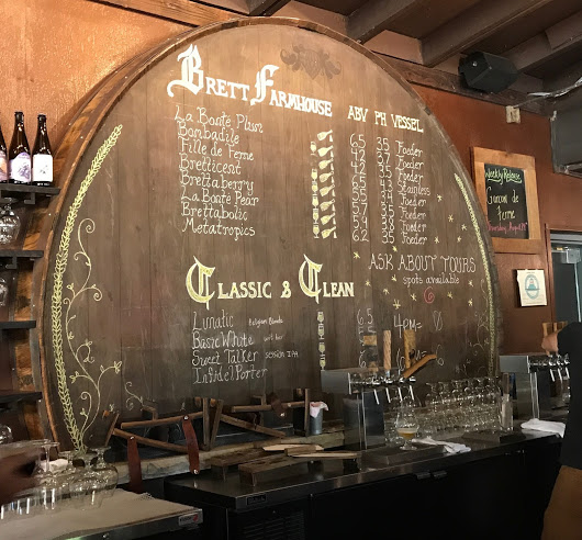 Kapea baari, todella pitkä tiski, koko tilan pituinen, tynnyrivarastoja taaempana. 12 hanaa barrel-aged soureja, kahdeksan hanaa brett farmhouseja, neljä ”cleania” hanaa, joissa belgiblonde, wit, session ipa ja porter. Ensimmäiseltä listalta valitsin ilman sen kummempia kriteereitä vahvimman Plainsdealerin, 8%,— pH 3,3, bourbon-vesseli, mukana jotain lemon zestiä. Aika intensiivistä puuta, happamuutta hyvin, mutta ei erityisen vahvasti. Bourbonia en havaitse, kirpeää marjaisuutta. Hyvältä tuntuu, ehkä vanilja hieman pilkistää, silti hyvin kuivaa. Asheville (NC), Funkatorium, 23.8.2017.