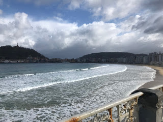 Käveleskelin aamiaisen jälkeen Kontxa-lahden länsipäähän poikkeuksellisen epävakaassa säässä. Satoi ja...