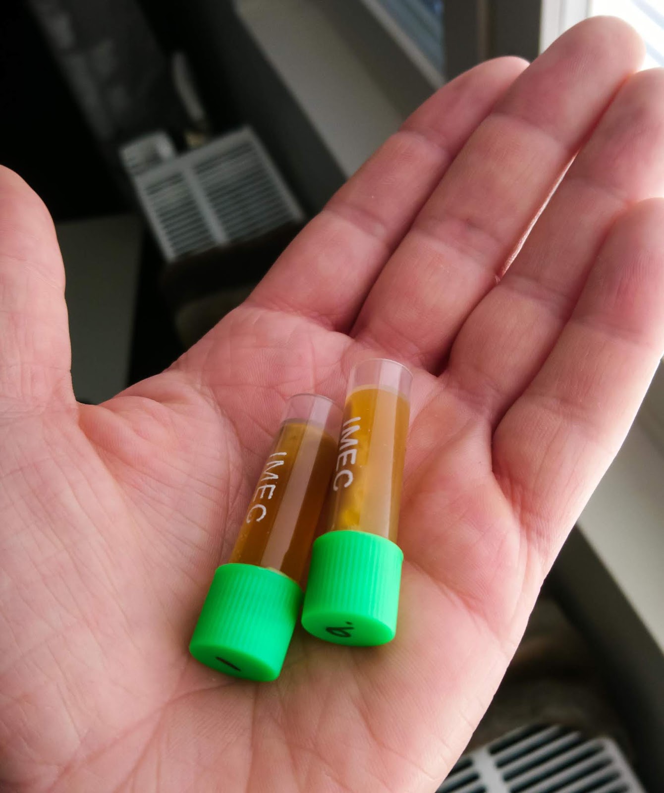 Ja entä se ensimmäinen oma kveik-kokeilu? Sveiniltä tilaamani hiivat saapuivat naurettavan pienissä 2,5 ml putkiloissa, joissa varsinaista hiivaa oli ehkä 0,5 ml. Päätin heti katsoa, mihin tämä myyttinen hiiva pystyy. Tein kahden litran