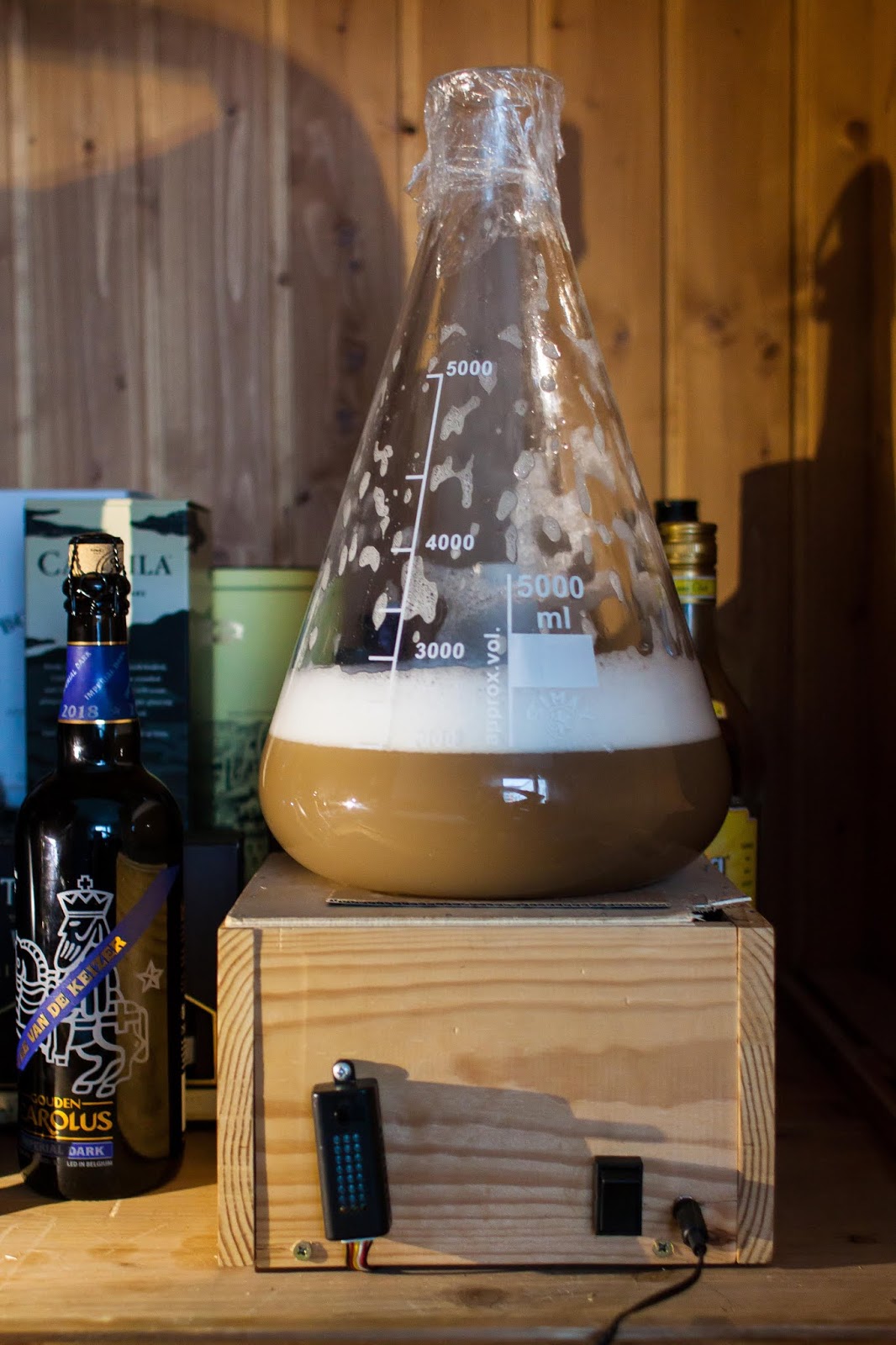 Tämän jälkeen pullo siirtyy katu-uskottavan magneettisekoittimemme päälle, missä se saa viettää noin vuorokauden verran. Tänä aikana startteri ehtii yleensä käydä loppuun, mutta tässä kannattaa käyttää järkeä. Iäkkäällä, pitkään jääkaapissa majailleella hiivalla käyminen voi olla hitaampaa. Käymistä kannattaa myös vähän seurailla, koska tässäkin tapauksessa pullon muoto saa vaahdon hiipimään ylöspäin kuin… vaahdon erlenmeyer-pullossa. Vaahdon ehkäisemiseen löytyy Antifoam-nimisiä tuotteita, mutta itselläni ei ole niistä kokemusta. Jos vaahto on karkaamassa pullosta, olen yleensä vain hölskytellyt sen takaisin nesteen joukkoon.