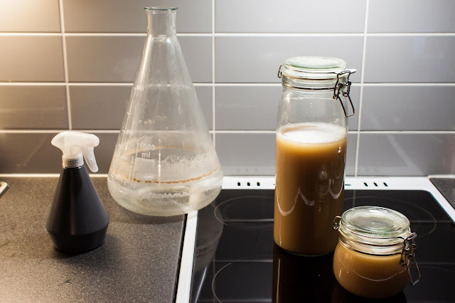 Kun pullo on levyllä, sille ei kannata kääntää selkäänsä. DME-vierre kuohahtaa hyvin herkästi, ja erlenmeyer-pullon muoto on sellainen, että kuohumisen alettua vaahto kiipeää suuaukolle sekunneissa. Pieni harhautuminen Facebookin selailuun, ja seurauksena on palaneen tahman jynssäämistä liedeltä. Siis nopea kiehautus ja pois levyltä. Sitten jäähtymään joko kylmään vesihauteeseen tai talvella parvekkeelle.