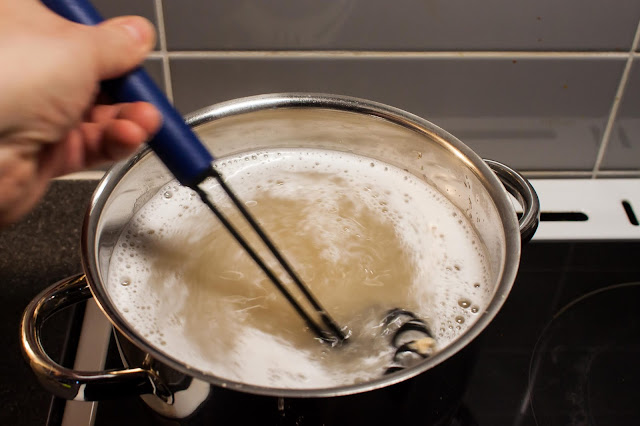 Olen ottanut tavaksi mitata startteriveden ensin kattilaan ja aloittaa lämmittämisen siinä. Tämä sen vuoksi, että kattilassa mallasuutteen sekoittaminen joukkoon on huomattavasti helpompaa kuin erlenmeyer-pullossa. Lämmitän vettä vain sen verran, että jauhe liukenee. Vispilällä sohiminen auttaa asiaa.