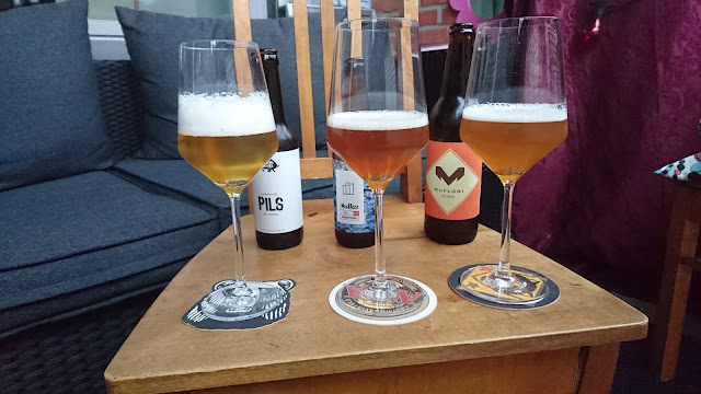 Lasiin kaadettuna väri- ja vaahtoeroja löytyy. Sulun kaunis kuparinen väri antaa viitteitä maltaisuudesta, kun taas Sonnisaaren kellertävä väri ja varsin paksu vaahto viittaa kepoisempaan suuntaan. Sulun vaahto katoaa nopeasti, kun taas värissä kahden edellisen väliin sijoittuva Mufloni pitää suurikuplaisen puolikkaan sormen vaahdon pidempään. Vaikea valita suosikkia, mutta puolikkaan sormen mitalla Muflonille tämä osio.