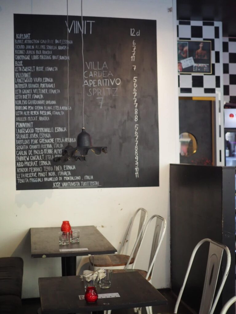 Rennossa baarissa onkin mukava istuskella pidempään, varsinkin kun viinin valinta on tehty helpoksi. Pöydillä on pahvisia kortteja, joihin merkitään tiskillä ruksejä sen mukaan, kuinka monta ja minkä hintaista viiniä pöytään on tarjoiltu. Lähtiessä maksetaan pahvin ruksit yhteenlaskien. Hinnat ovat selkeästi Helsingin keskustan viinihintoja kohtuullisemmat, mutta Johansson uskookin volyymin voimaan. – Jos viinit ovat kohtuuhintaisia, asiakas viihtyy pidempään ja tilaa enemmän, kertoo hän.