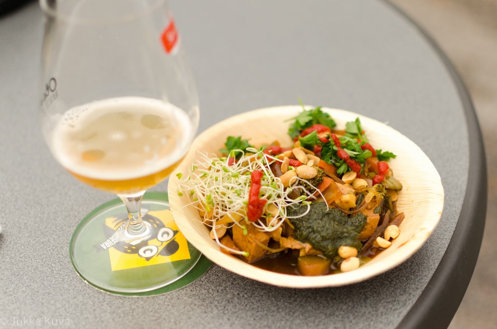 Alue oli aika pitkään aika hiljainen, vaikka aamulla pelotellut sade kaikkosikin ennen ovien aukeamista eikä tullut koko päivänä takaisin. Cool Headillekin pääsi ilman jonoa. Laurean opiskelijavetoista ruokatiskiä johtanut Anikó tarjosi vegaaniruokaa arvioon ja kyllähän aina sen verran vatsasta tilaa löytyy. Vegewokki oli erinomainen, BBQ-wrap ja ”oluen 3 kaveria” – niminen snacksilautanen varsin kehityskelpoisia annoksia. Hinta-kokosuhde oli kaikissa mainio ja runsaista lisämausteista plussaa. Toivottavasti vastaavanlainen tiski nähdään jossain tulevassakin oluttapahtumassa.
