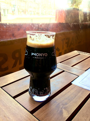 Tiistaina, lähtöpäivänä teimme vielä pienen kierroksen oluen merkeissä. Meinasimme mennä Jonas Craft beer houseen, mutta heillä ei ollut tarjolla ruokaa, niin siirryimmekin kauppakeskuksen toiseen päähän lounaalle. Ruuan jälkeen kävelimme kauppahallin läpi Monyon baariin. Ulkonäöltään aika mitäänsanomaton baari, kymmenisen hanaa, pääasiassa panimon omia oluita. Otin huomaamattani valikoiman ainoan oluen, joka ei ollut unkarilainen. Aegirin tynnyrikypsytelty stout oli tiukka ja monipuolinen, vaikka vahvuutta ei ollut kuin 8 %.