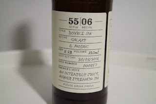 Kaikki BBN0 panimon oluet nimetään kahdella eri numerolla, kuten esimerkiksi tässä ensimmäisessä arvioissani olut on nimeltään 55/06. Tämä tarkoittaa, että ensimmäinen numero kertoo oluttyylin ja toinen numero kertoo, että monesko tyylinsä edustaja se heillä on. Eli tämä olut on Double IPA -sarjan kuudes versio. Suosittelen, että menette panimon sivuille katsomaan olutlistan, koska se on kyllä hienon näköinen.