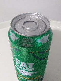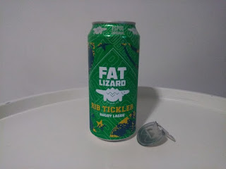 Sitten ensipuraisu Fat Lizard Brewingin aromitölkkeihin ja se aloitellaan Rib Tickler Rugby Lagerilla. Tämä tölkkimalli poikkeaa normaalista tölkistä sillä, että siitä irtoaa koko kansi irti. Idea on hauska, mutta itse kuitenkin juon 99 % oluistani lasista. Lopuissa yhdessä prosentissa sitten pakkauksella ei niinkään ole väliä.