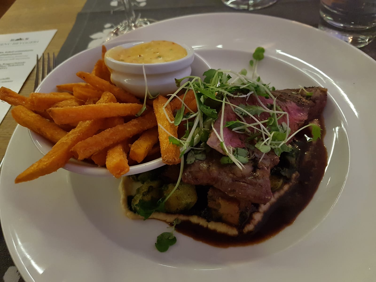 | Grillattu Flank steak, savuselleripyreetä, bataattiranskalaisia sekä tryffelillä ja chilillä maustettua Bearnaisekastiketta |