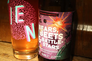 Sitten mennään tähän olueeseen, joka on punajuuri-kuusenkerkkä sour ale. Eli nyt pääsen (joudun) maistamaan punajuurella maustettua olutta. Jännittää! Oluen nimi Bears, Beets & Battlestars taitaa tarkoilla monenlaisia merkityksiä. Beets ainakin viittaa juurikin punajuureen. Toinen viittaus menee The Office -sarjaan.