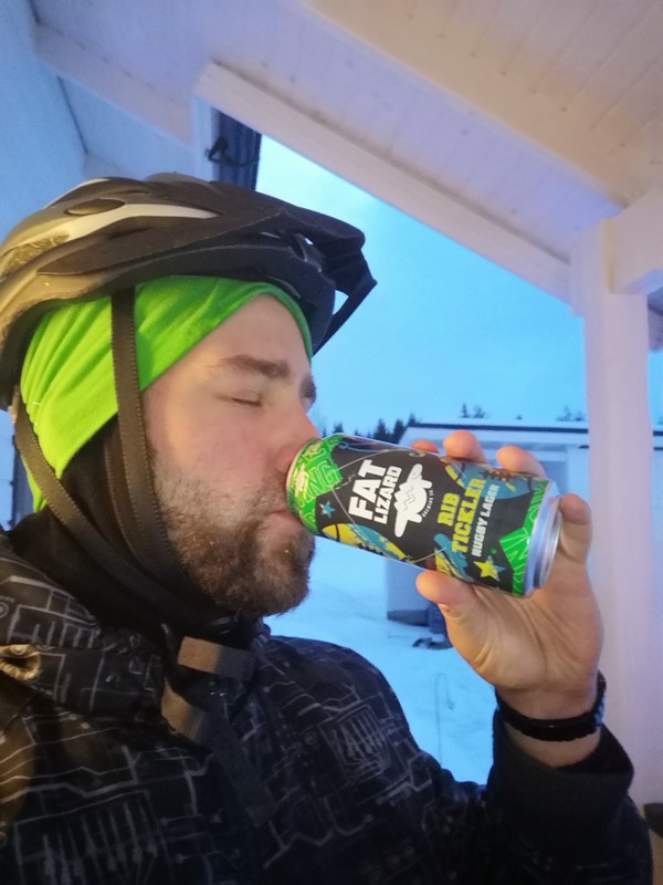 Nauttimistilanne: 22 kilometriä fatbikella loskassa ja lopputuloksena oli päästä varpaisiin litimärkä pyöräilijä. Pääsin sisälle, napsautin saunan päälle ja seuraavana napsautin liskopurkin auki. Puolet oluesta hävisivät ikeniin ja loppuja sitten ehdinkin jo maistamaan.