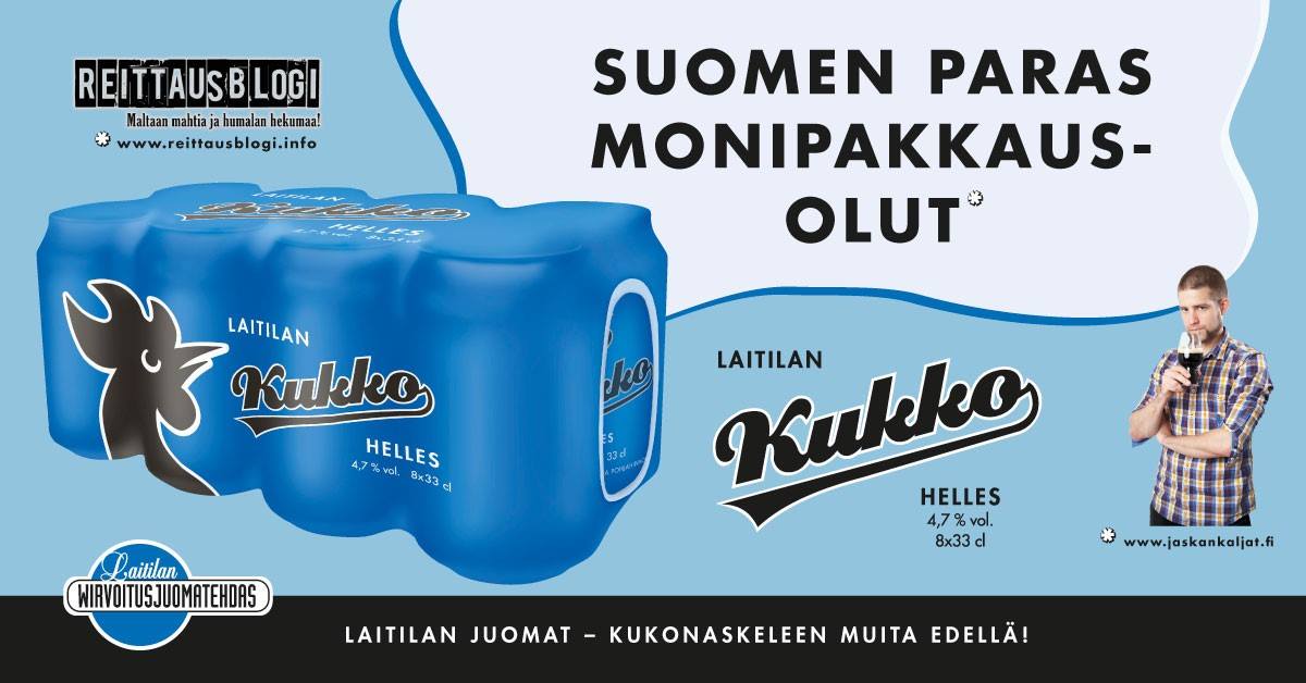 Kukko Helles on myyntiin tulon jälkeen ollut itselläni yksi juoduimpia oluita. Kyseistä olutta saa myös 8 kpl monipakkauksissa ja taitaapa olla ainoita monipakkauksia, jotka kotia kantautuvat. No toinen on tietysti Pilsner Urquell nelipäkki. Hämmästyin itsekin, että olen näitä useita juonut, muttei missään vaiheessa ole tullut tehtyä arviota. Sosiaalisessa mediassa kehuin, että kyseessä on Suomen paras monipakkausolut ja siitähän Laitilan Wirvoitusjuomatehdas teki ihan mainoksenkin. Kyseisen mainoksen olen nähnyt muutamassa kaupassakin.