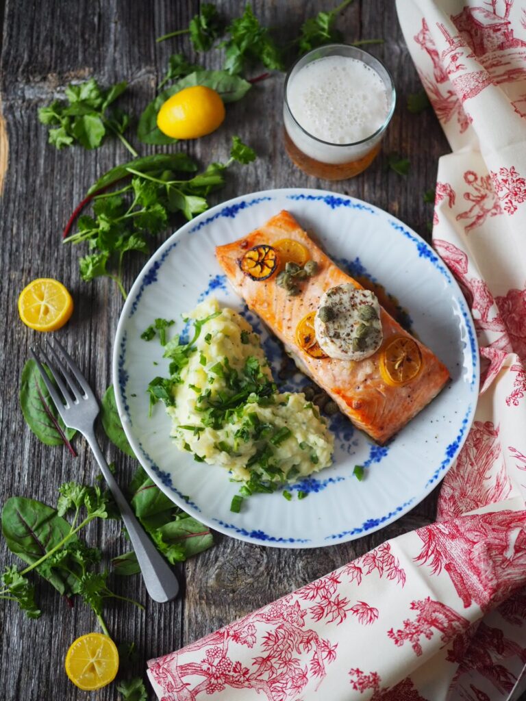 Olutsuolapaahdettu lohi, sinappivoi ja vihreä yrttiperunamuusi