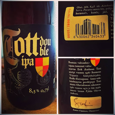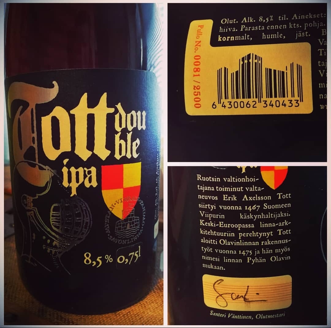 Meripihkaisen mystisen Tott Double IPA—´n tuoksussa mennään Savonlinnan eastsidelle raidesiltaa pitkin ja kohti havuisia Kyrönniemen metsäpolkuja. Suutuntuma on muhkean maltainen ja margariinisen mairea, mutta humalointi hukkuu jonnekin matkalla Nätkiin, kunnes jälkimaussa ponnahtaa jälleen pintaan kuin norppa avannosta. Greippinen katkeruus pysyy koko taipaleen eksymättä polulta ja männynkävyt suorastaan rouskuvat mokkasiinien mäiskeessä. Vuotta aikaisemmin tätä samaa reseptiikkaa myytiin ulos ainoastaan panimon omasta puodista ja litrahinta oli jotain aivan muuta. 2500:n ensipullon litrahinta hipoi kolmeakymppiä ja nyt pikkupullon saa Alkosta alta neljän euron. Mutta nämä eivät olekaan numeroituja painoksia. Silti, kopaskaa heti omanne pois!