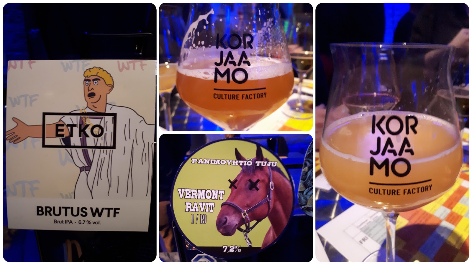 ETKO Brewing Brutus WTF Brut IPA (6,7 %) oli kuiva, leipäinen ja hieman sitruksinen. Katkeruutta oluessa oli kohtuullisesti. Panimoyhtiö Tujun Vermont Ravit 1/19 IPA:n (7,2 %) aromimaailmassa oli puolestaan trooppista hedelmäisyyttä, greippiä, ananasta, appelsiinia ja mangoa. Melkoinen hedelmäpommi siis.
